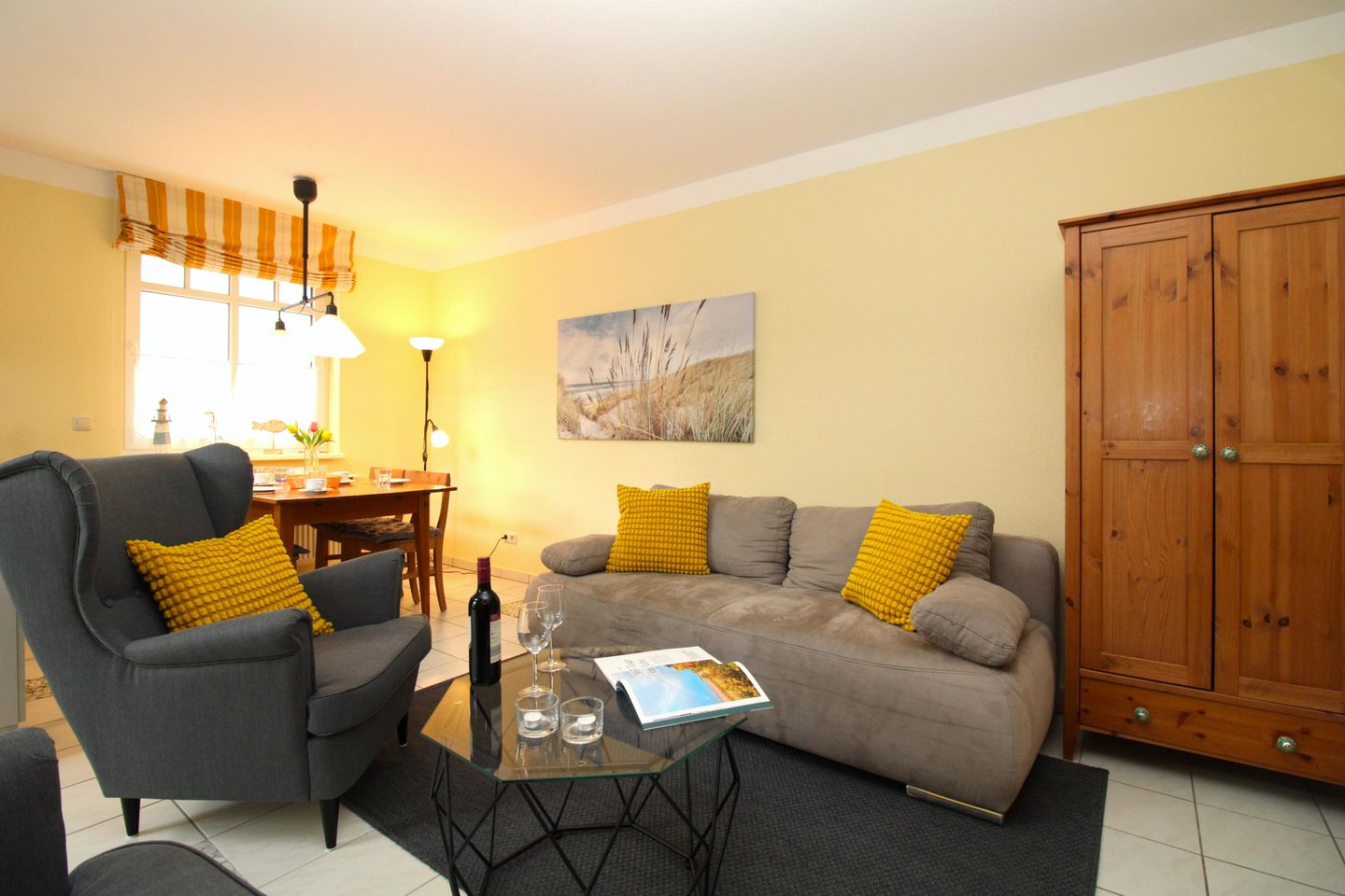 Das geräumige und helle Wohn-/Esszimmer verfügt über eine separate Sitzgruppe mit bequemer (ausziehbarer Schlaf-)Couch, 2 Sesseln und Couchtisch, einen separaten Esstisch mit 4 Stühlen, einen Schrank sowie eine Kommode. Vom Wohnzimmer aus haben Sie direkten Zugang zu der ca. 6,5 m² großen und sonnigen Terrasse (nach Süd-Osten zum Innenhof ausgerichtet) mit Gartenmöbeln. Hier sitzen Sie entspannt und gemütlich im Grünen und können abends bei einem guten Glas Wein in Ruhe die lauen Sommernächte genießen!
