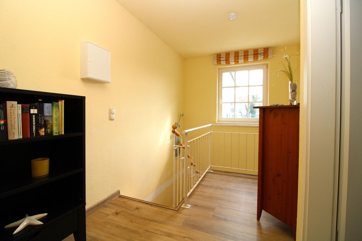 Über die innenliegende Treppe erreichen Sie die Galerie im 1. Obergeschoss. Hier befindet sich eine kleine Leseecke mit 2 bequemen Korbsesseln, einem kleinen Tisch, ein Sideboard und eine Kommode – der ideale Rückzugsort für ungestörten Lesegenuss!