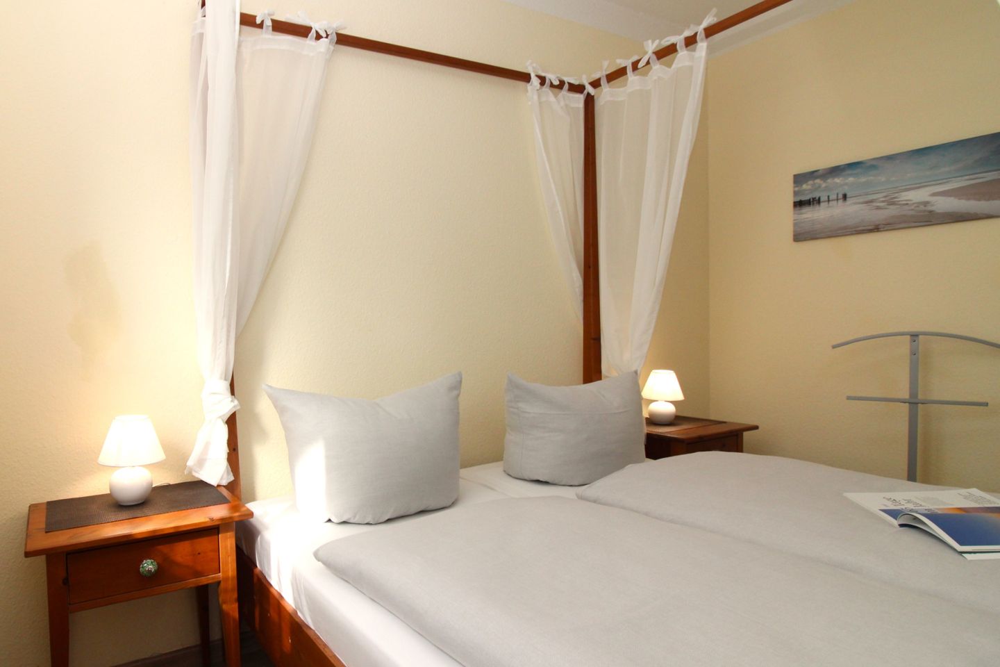 Das gemütliche Schlafzimmer ist mit einem bequemen Doppelbett (2 x 80 cm x 200 cm), Nachttischen mit Nachttischlampen, einem geräumigen Kleiderschrank, einem Kleiderständer sowie einem Stuhl eingerichtet.