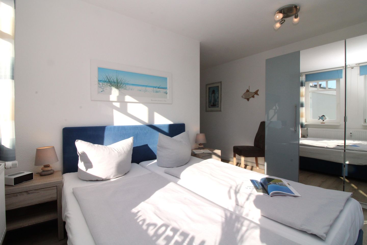 Das helle und gemütliche 1. Schlafzimmer ist mit einem bequemen Doppelbett (2 x 80 cm x 200 cm), Nachttischen mit Nachttischlampen, einem geräumigen Kleiderschrank sowie einem großen Wandspiegel eingerichtet.