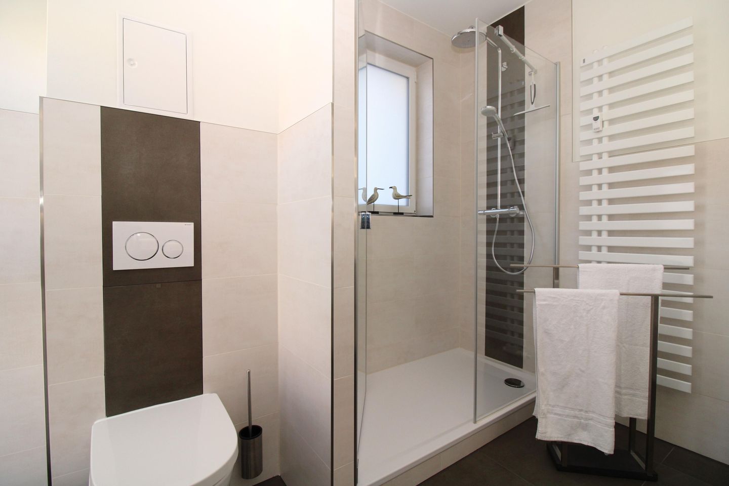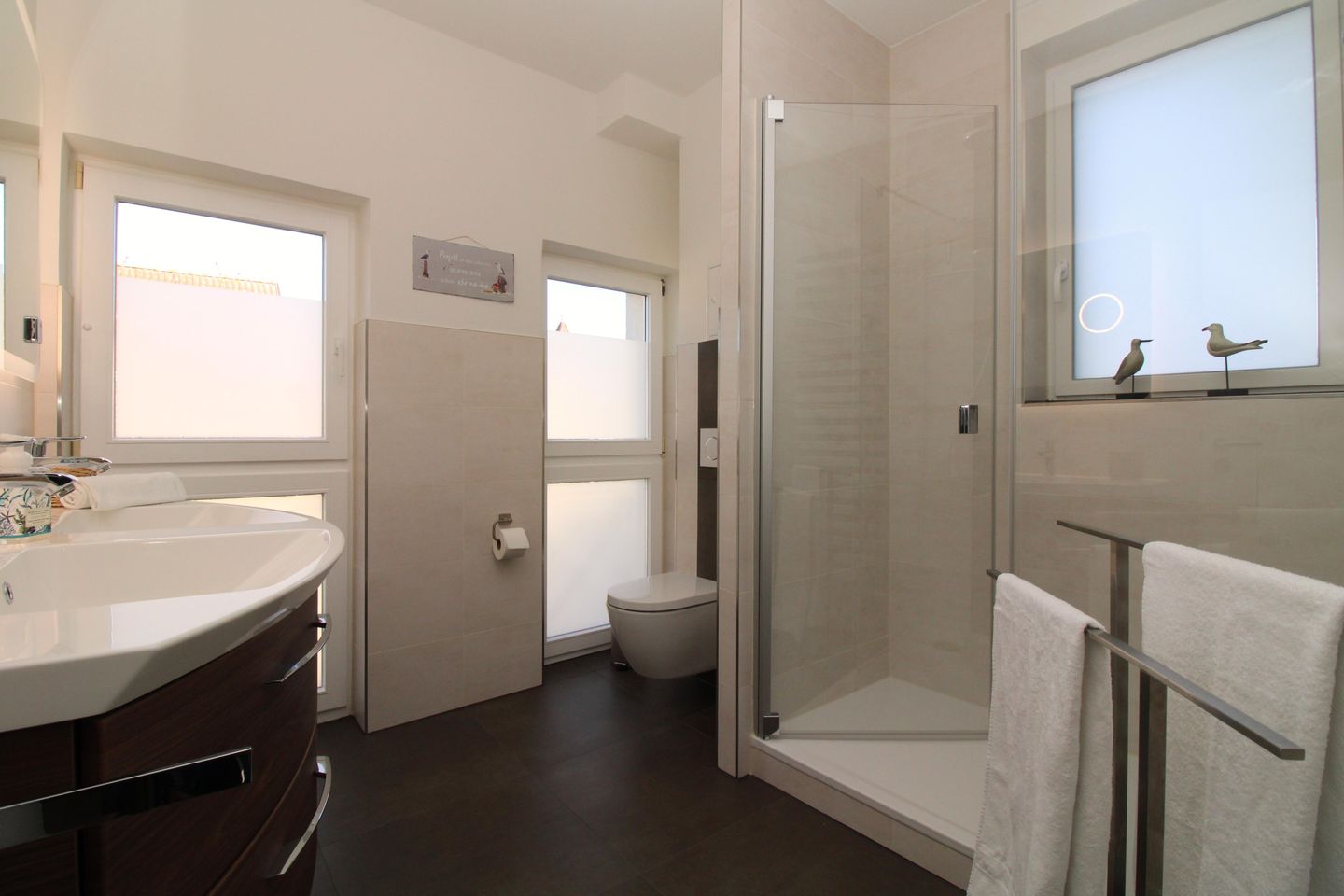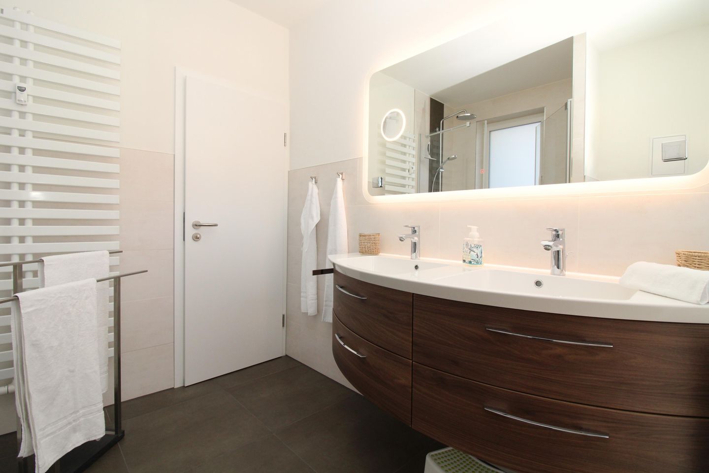 Das im Jahr 2025 renovierte, moderne und geräumige Badezimmer (mit Tageslicht / großen Fenstern) verfügt über eine Echtglas-Dusche mit niedrigem Einstieg, einen Doppelwaschtisch mit Unterschrank und großem Wandspiegel, WC, Handtuch-Heizkörper, Handtuchständer, Föhn, Kosmetikspiegel sowie ausreichend Ablagemöglichkeiten.