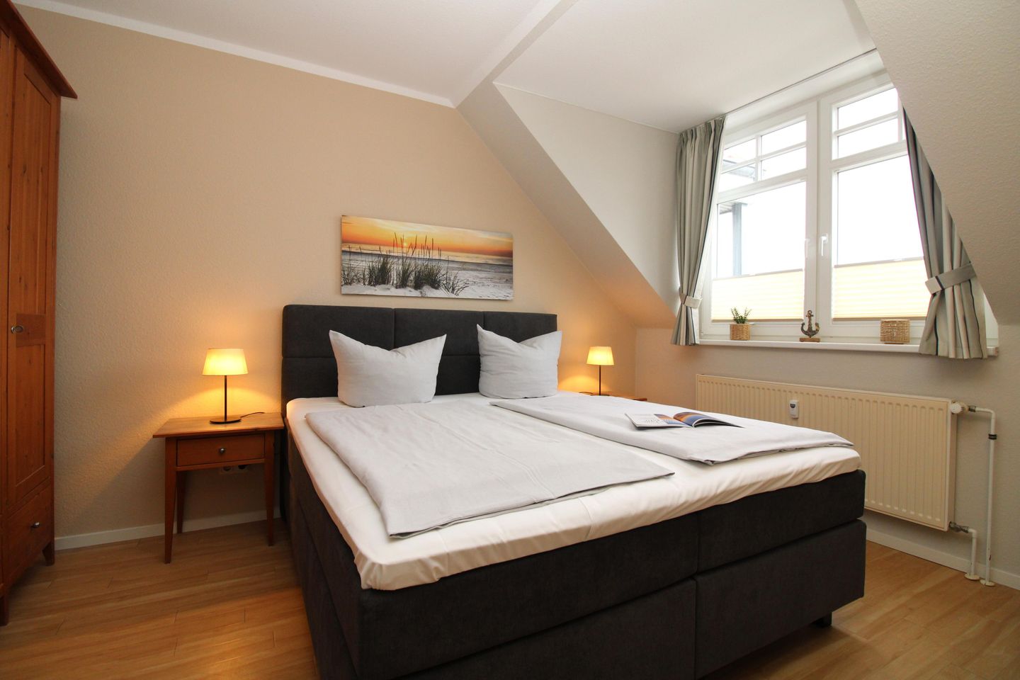Das sehr gemütliche 1. Schlafzimmer ist mit einem bequemen Boxspring-Doppelbett (180 cm x 200 cm), Nachttischen mit Nachttischlampen, einem geräumigen Kleiderschrank sowie einem bequemen Korbsessel eingerichtet.