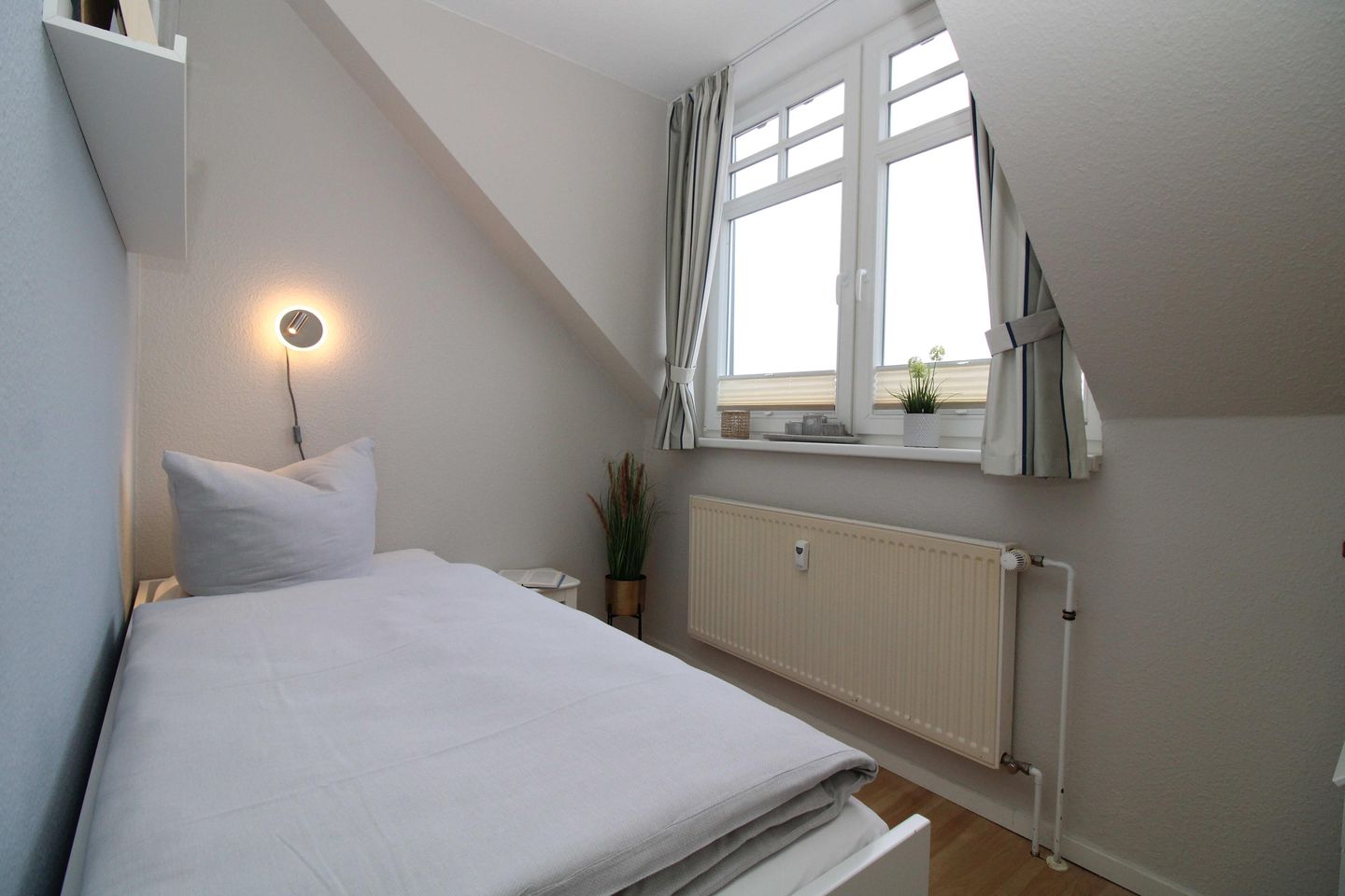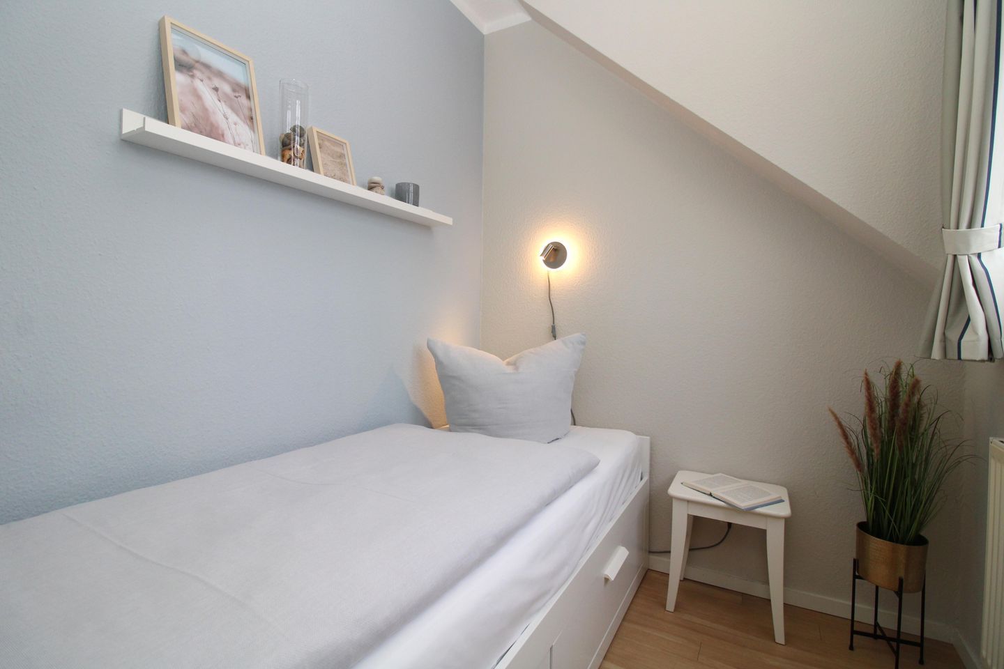 Das separate und zusätzliche 2. Schlafzimmer verfügt über ein bequemes Einzelbett (80 cm x 200 cm) inkl. ausziehbarem Rollbett für 2 Personen, Nachttische mit Nachttischlampen sowie eine geräumige Kommode.