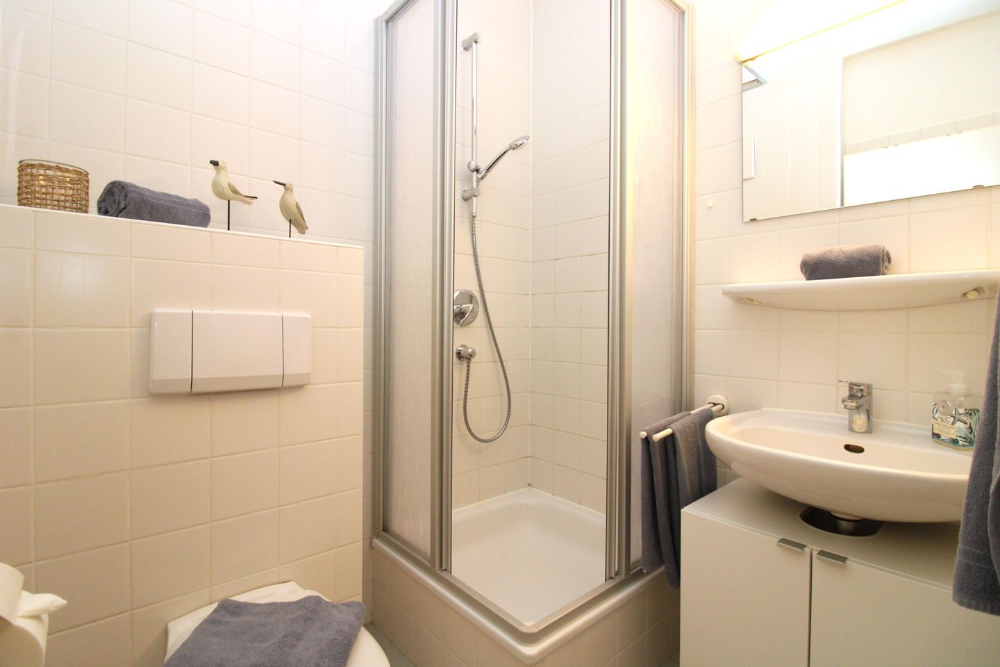 Das Badezimmer verfügt über eine Dusche, Waschbecken mit Unterschrank, WC, Handtuch-Heizkörper, Föhn sowie ausreichend Ablagemöglichkeiten.