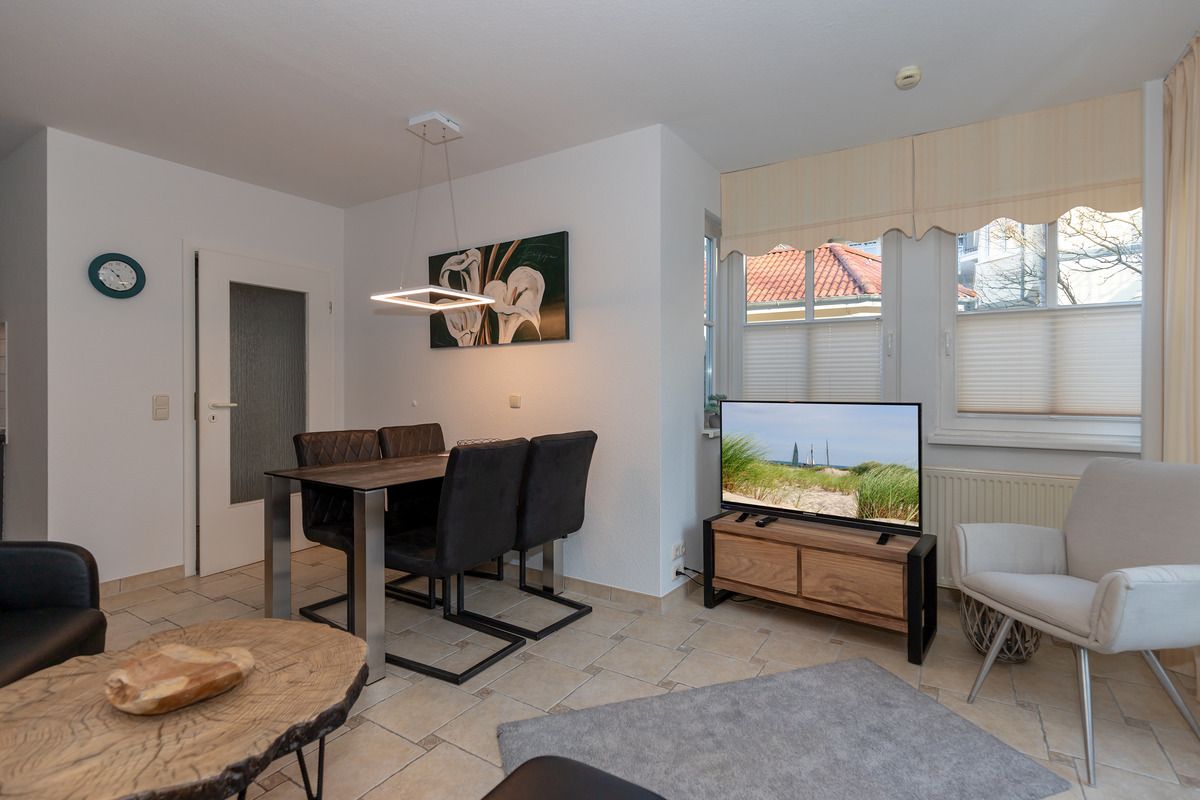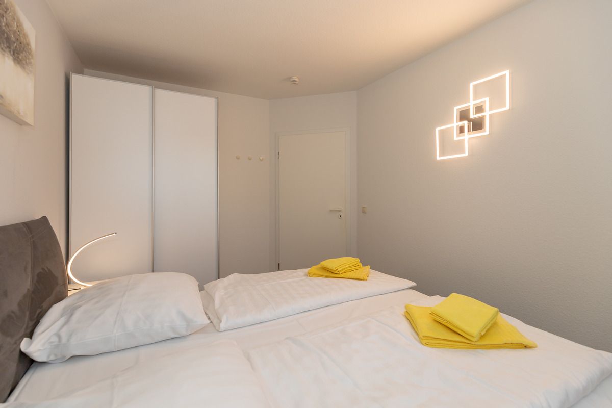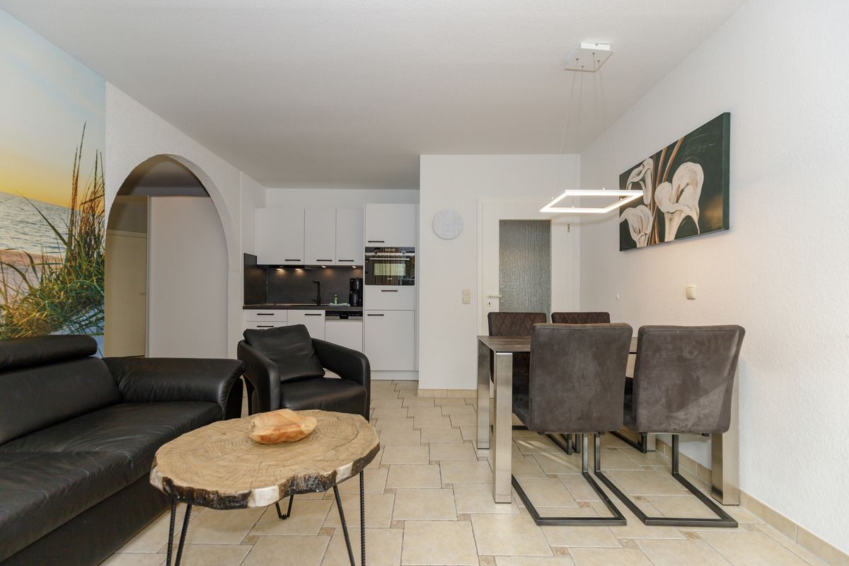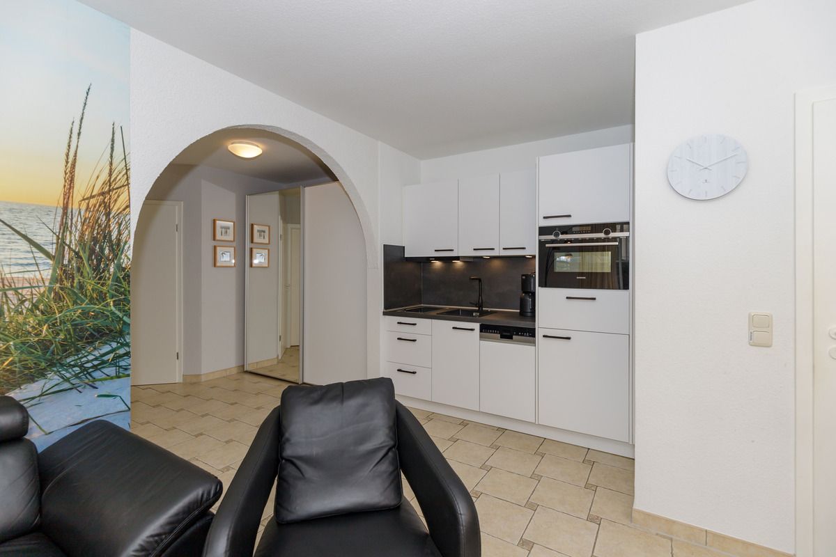 Das strandnahe und moderne 3-Zimmer-Appartement 232 (ca. 52 m²) im Erdgeschoss im Haus B besitzt ein hohes Maß an Wohlfühlkomfort und ist komplett eingerichtet. Der Bodenbelag in den beiden Schlafzimmern ist hochwertiger Vinyl-Designbelag in edler Holzoptik, alle anderen Räume sind gefliest.