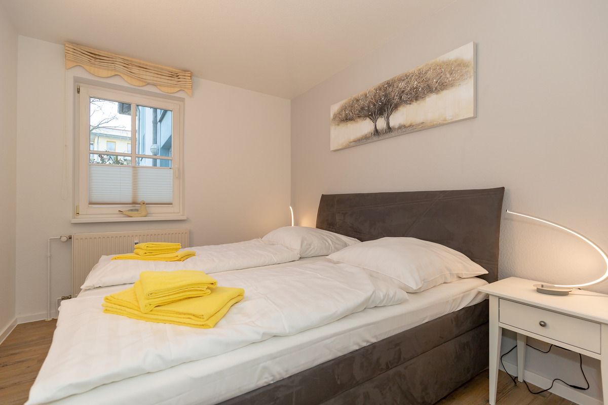 Das gemütliche 1. Schlafzimmer ist mit einem bequemen Boxspring-Doppelbett (2 x 90 cm x 200 cm), Nachttischen mit Nachttischlampen sowie einem geräumigen Kleiderschrank eingerichtet.