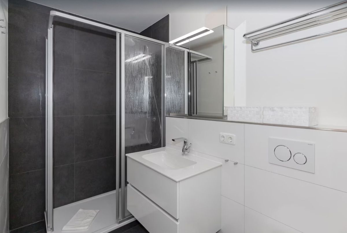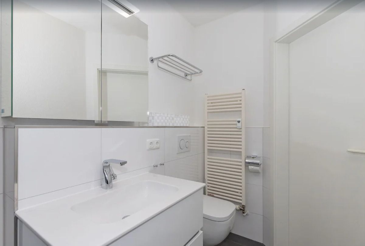 Das moderne Badezimmer verfügt über eine begehbare Dusche (seniorenfreundlich(!) mit niedrigem Einstieg), Waschbecken mit Spiegelschrank und Unterschrank, WC, Föhn, Handtuch-Heizkörper sowie ausreichend Ablagemöglichkeiten.