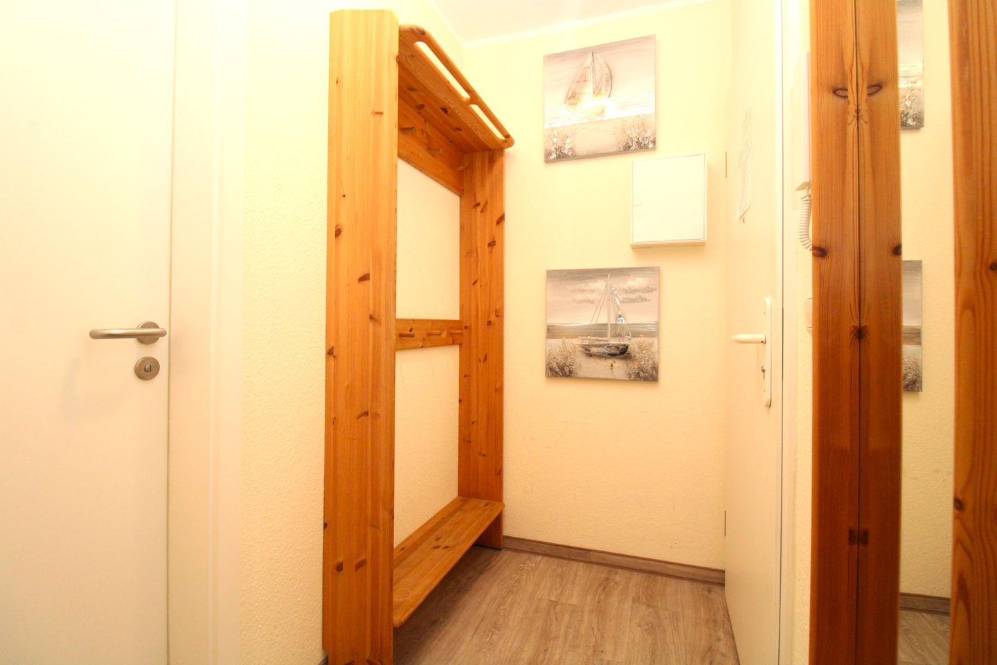 Ihre Jacken und Schuhe können an der großen Garderobe mit Wandspiegel im Eingangsbereich des Appartements untergebracht werden.