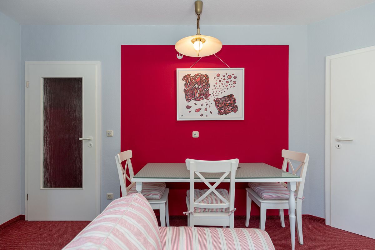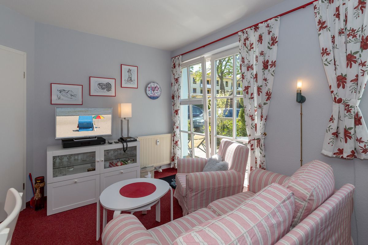 Das freundliche und helle Wohn-/Esszimmer verfügt über eine separate Sitzgruppe mit bequemer Couch, einen Sessel und Couchtisch, einen separaten Esstisch mit 3 Stühlen sowie ein Sideboard. Vom Wohnzimmer aus haben Sie direkten Zugang zu der ca. 11 m² großen und sonnigen Terrasse (zum Hof nach Süden ausgerichtet) mit Terrassenmöbeln und Strandkorb. Hier sitzen Sie entspannt und gemütlich im Grünen und können abends bei einem guten Glas Wein in Ruhe die lauen Sommernächte genießen!