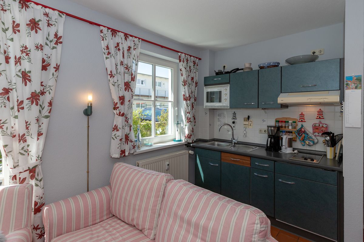 Die offene Küche beinhaltet eine voll ausgestattete Einbauküchenzeile mit 2-Zonen-Ceran-Kochfeld, Dunstabzug, Mikrowelle, Kühlschrank mit Gefrierfach, Geschirrspülmaschine, Kaffeemaschine, Wasserkocher und Toaster. Auf Wunsch stellen wir Ihnen auch gerne einen portablen Backofen zur Verfügung. Die Küche ist mit Geschirr, Gläsern, Besteck und Töpfen komplett ausgestattet.