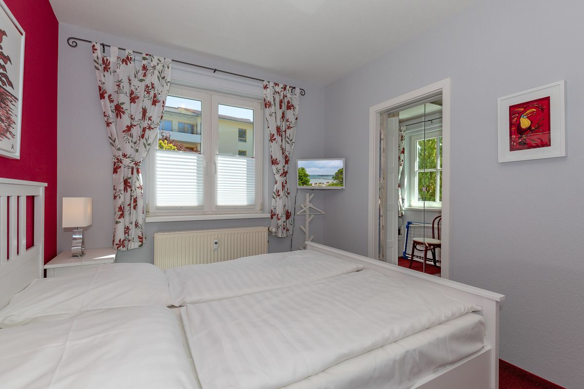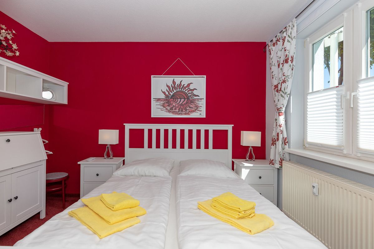 Das gemütliche 1. Schlafzimmer ist mit einem bequemen Doppelbett (2 x 80 cm x 200 cm), Nachttischen mit Nachttischlampen, Kommode (mit Sekretär), 2 Garderobenständern, einem Hocker sowie einem Hängeregal eingerichtet.
