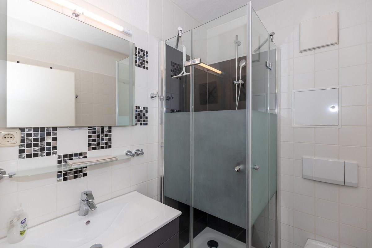 Das moderne Badezimmer verfügt über eine Echtglas-Dusche mit niedrigem Einstieg (seniorenfreundlich!), Waschbecken mit Unterschrank, WC, Föhn, einen Handtuch-Heizkörper sowie ausreichend Ablagemöglichkeiten.