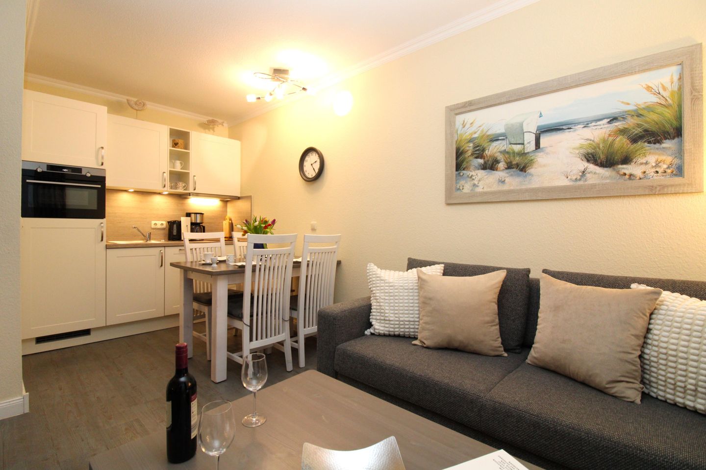 Die offene Küche beinhaltet eine voll ausgestattete Einbauküchenzeile mit 2-Zonen-Ceran-Kochfeld, Kombi-Backofen mit Mikrowelle, Dunstabzug, Kühlschrank mit Gefrierfach, Geschirrspülmaschine, Kaffeemaschine, Wasserkocher und Toaster. Die Küche ist mit Geschirr, Gläsern, Besteck und Töpfen komplett ausgestattet.