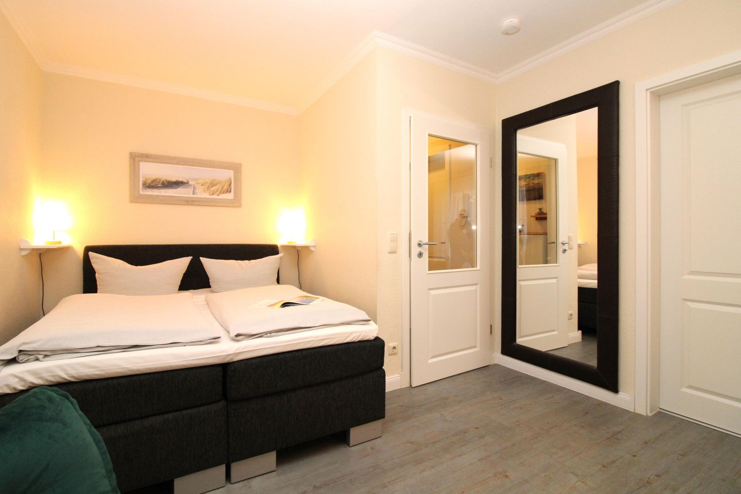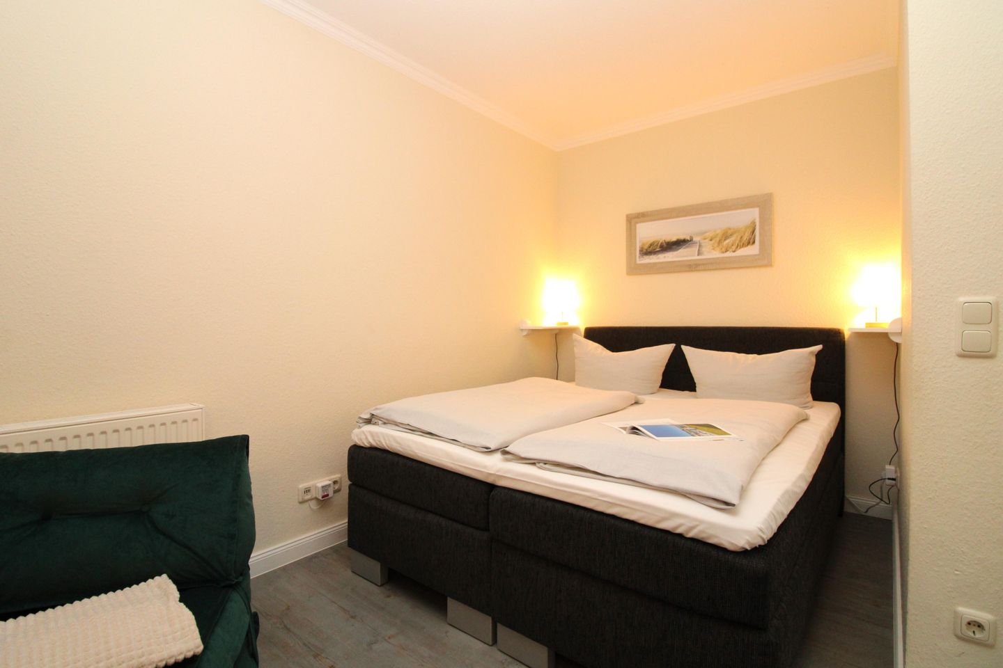 Der gemütliche Schlafbereich ist mit einem bequemen Boxspring-Doppelbett (160 cm x 200 cm), Nachttischen mit Nachttischlampen sowie einem geräumigen Kleiderschrank (im Nebenraum) eingerichtet.