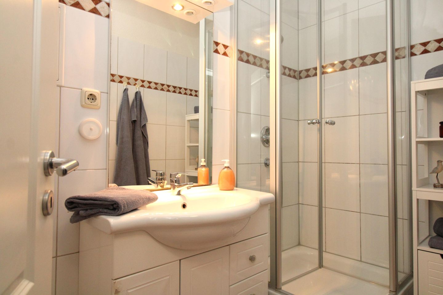 Das Badezimmer verfügt über eine Echtglas-Dusche, Waschbecken mit Unterschrank und großem Spiegel, WC, Handtuch-Heizkörper, Föhn sowie ausreichend Ablagemöglichkeiten.