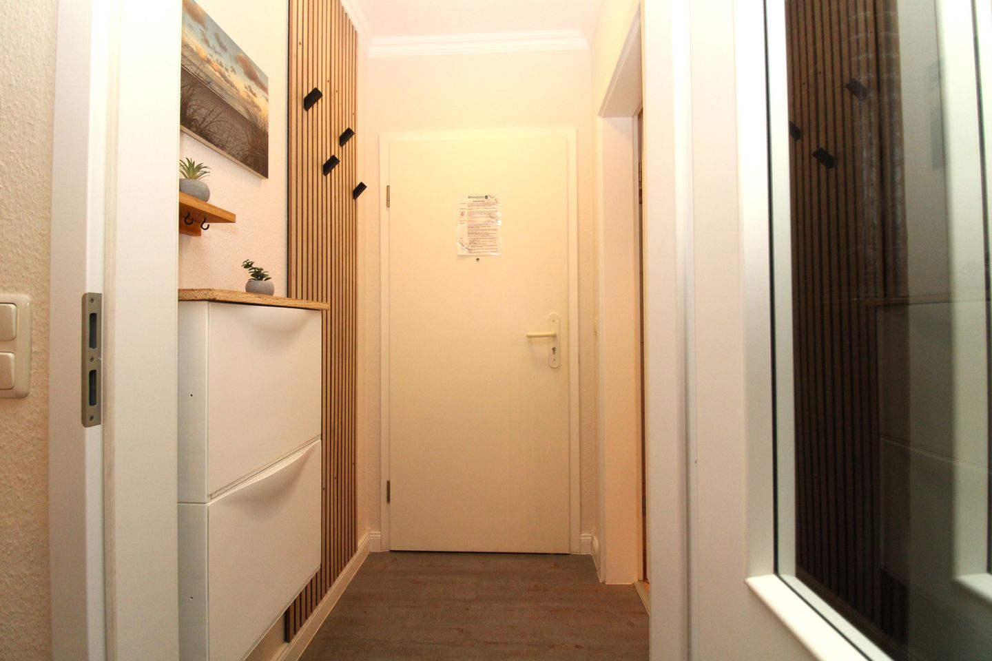 Ihre Jacken und Schuhe können Sie an der großen Garderobe mit Schuhschrank und großem Wandspiegel im Eingangsbereich des Appartements unterbringen.