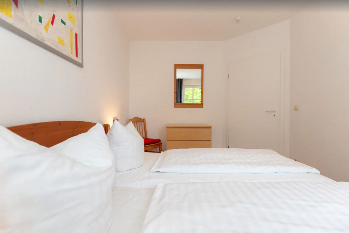 Das strandnahe, freundliche und helle 3-Zimmer-Appartement 241 (ca. 52 m²) im 1. Obergeschoss im Haus B (ohne Fahrstuhl) besitzt ein hohes Maß an Wohlfühlkomfort und ist komplett eingerichtet. Der Bodenbelag im Wohnzimmer und den beiden Schlafzimmern ist hochwertiges helles Holzlaminat, der Flur, die Küche sowie das Bad / WC sind gefliest.