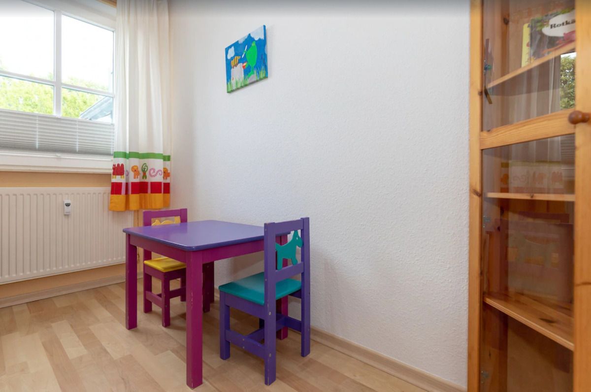 Das separate und zusätzliche 2. Schlafzimmer (Kinderzimmer) verfügt über ein bequemes Etagenbett (90 cm x 200 cm) für 2 Personen, einen Schrank sowie einen kleinen Kindertisch mit 2 Stühlen.