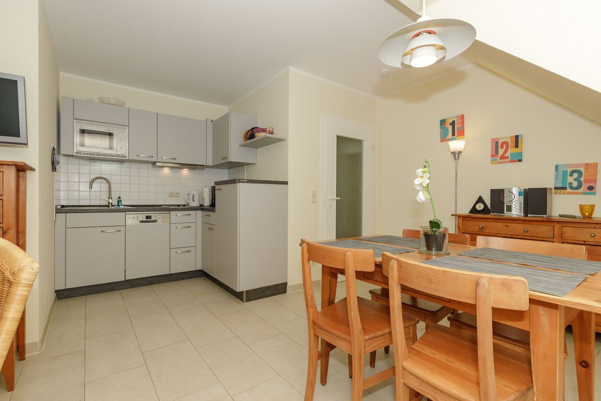 Das strandnahe und ruhige 3-Zimmer-Appartement 248 (ca. 47 m²) im 2. Obergeschoss im Haus C (ohne Fahrstuhl) bietet einen funktionalen Grundriss und ist komplett eingerichtet. Die Fußböden der Wohnung sind alle mit hellen Fliesen ausgestattet.