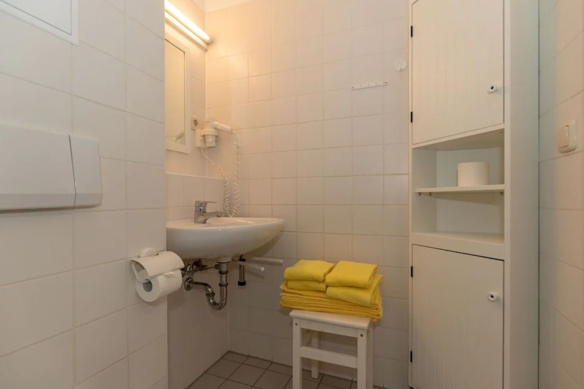 Das Badezimmer verfügt über eine Dusche, Waschbecken und WC, einen Badezimmerschrank, einen Hocker, einen Handtuch-Heizkörper sowie ausreichend Ablagemöglichkeiten.