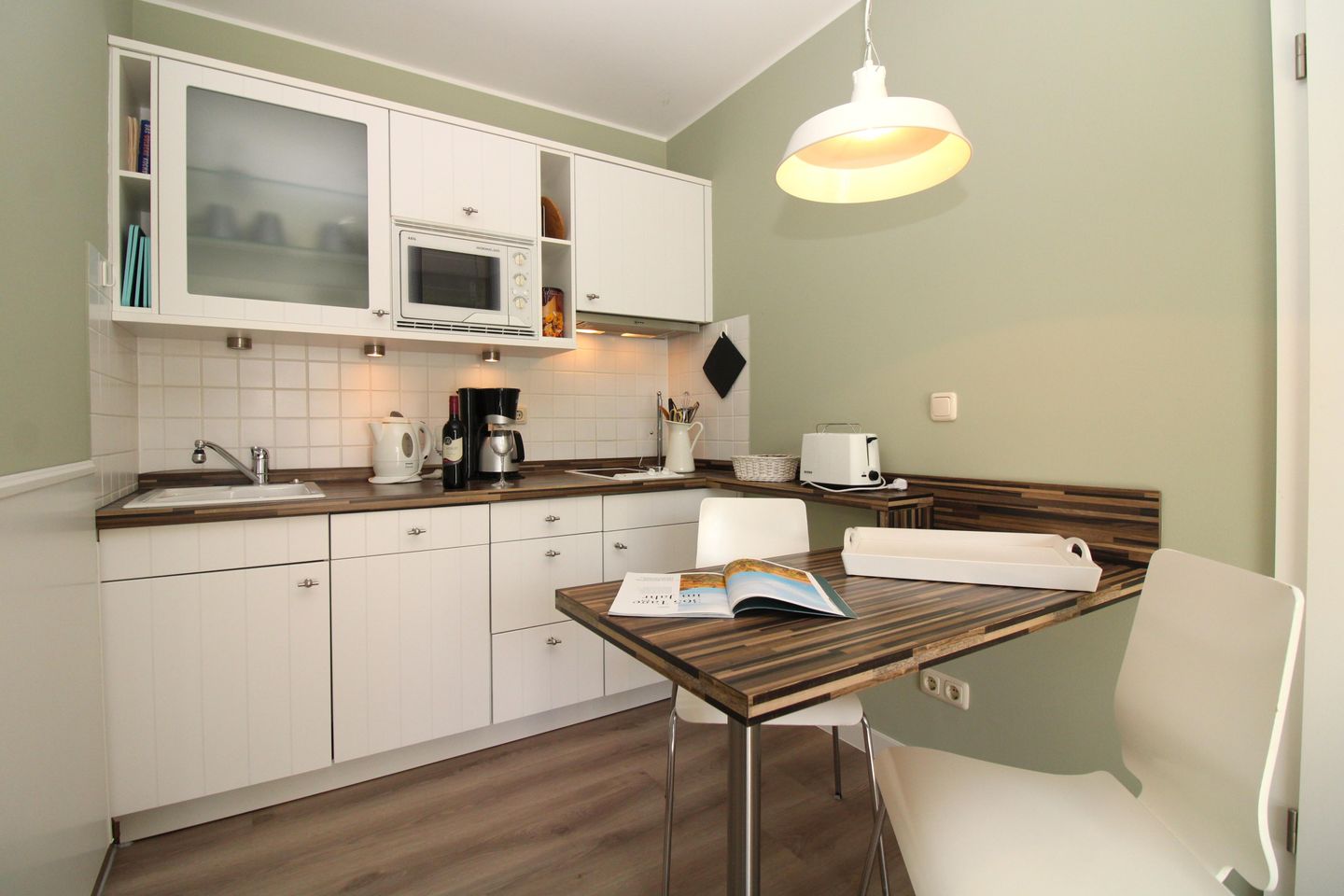 Die offene Küche beinhaltet eine voll ausgestattete Einbauküchenzeile mit 2-Zonen-Ceran-Kochfeld, Dunstabzug, Mikrowelle, Kühlschrank mit Gefrierfach, Geschirrspülmaschine, Kaffeemaschine, Wasserkocher und Toaster. Auf Wunsch stellen wir Ihnen auch gerne einen portablen Backofen zur Verfügung. Die Küche ist mit Geschirr, Gläsern, Besteck und Töpfen komplett ausgestattet. Der Küchenbereich verfügt weiterhin über einen kleinen Tresen mit 2 Stühlen für den „kleinen Hunger“ zwischendurch.