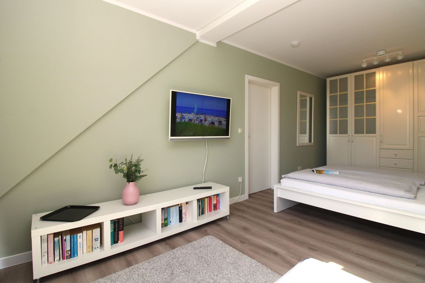 Das separate und zusätzliche 2. Schlafzimmer verfügt ebenfalls über ein bequemes Einzelbett (90 cm x 200 cm) und einen Nachttisch mit Nachttischlampe.