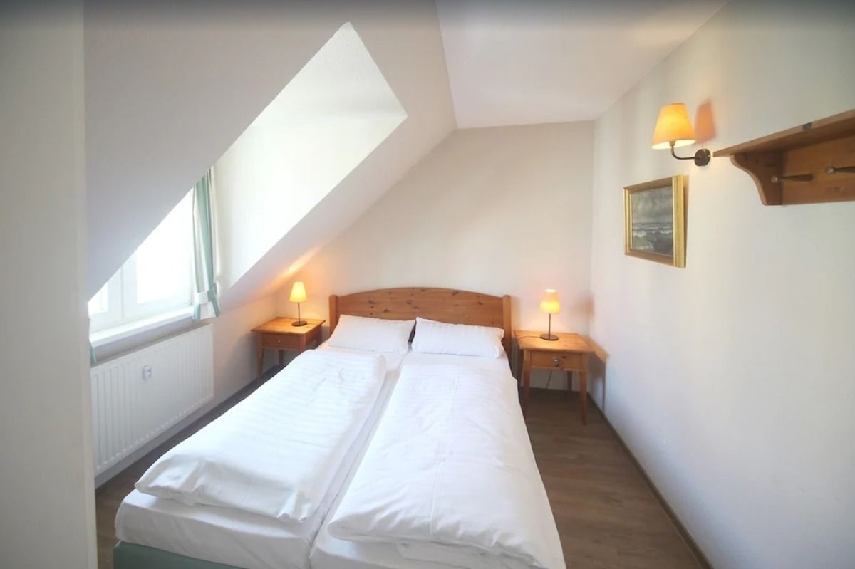 Das Schlafzimmer ist mit einem bequemen Doppelbett (2 x 80 cm x 200 cm), Nachttischen mit Nachttischlampen, einer Garderobenleiste sowie einem Kleiderschrank (in der Diele) eingerichtet. Für einen guten Schlafkomfort verfügt das Schlafzimmer auch über Verdunkelungsvorhänge.