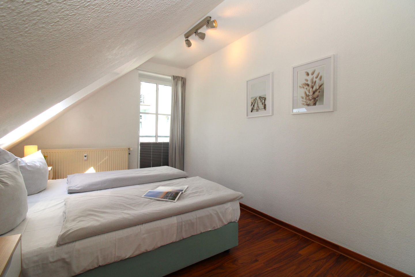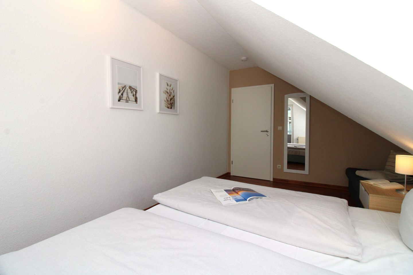 In einer durch einen Vorhang abgetrennten Nische des Wohnzimmers befindet sich ein weiterer kleiner Schlafbereich mit 2 getrennten Einzelbetten (80 cm x 200 cm) und Nachttisch mit Nachttischlampe. Für einen guten Schlafkomfort verfügen beide Schlafräume über Verdunkelungsvorhänge bzw. Rollos.